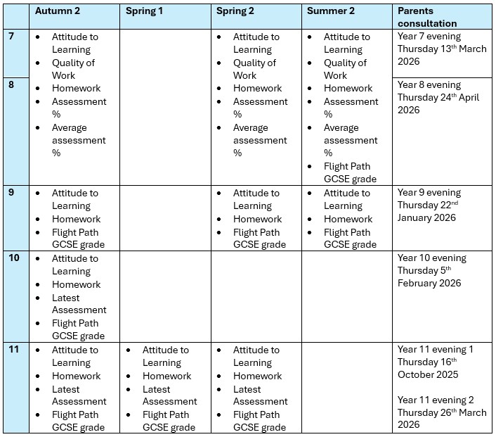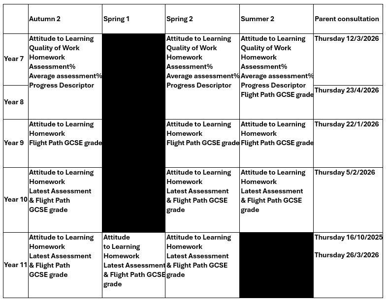 Progress from the Summer term of Year 7 through to the end of Year 11 is tracked in the vast majority of subjects using the GCSE grading system. Students are provided with a GCSE progress grade, which is the grade that each teacher believes, based on their professional judgement, that student will achieve in their subject at the end of Year 11. From the start of Year 9 this progress grade is compared to the Minimum Expected Grade in each subject which in turn is based on students’ prior attainment as measured by their Key Stage 2 results. Each student is assigned a Minimum Expected Grade based on benchmarks supplied by Fischer Family Trust (FFT). FFT is the organisation that processes all Key Stage 2 data for the Department for Education (DfE). More information about FFT can be found by following this link: Fischer Family Trust (FFT).