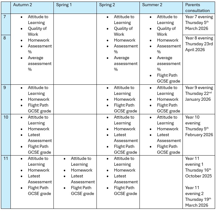 All reports are uploaded and can be accessed via the Talaxy App. Reports include guidance on the descriptors used and contain a pastoral summary: Achievement points, Behaviour points & Attendance.