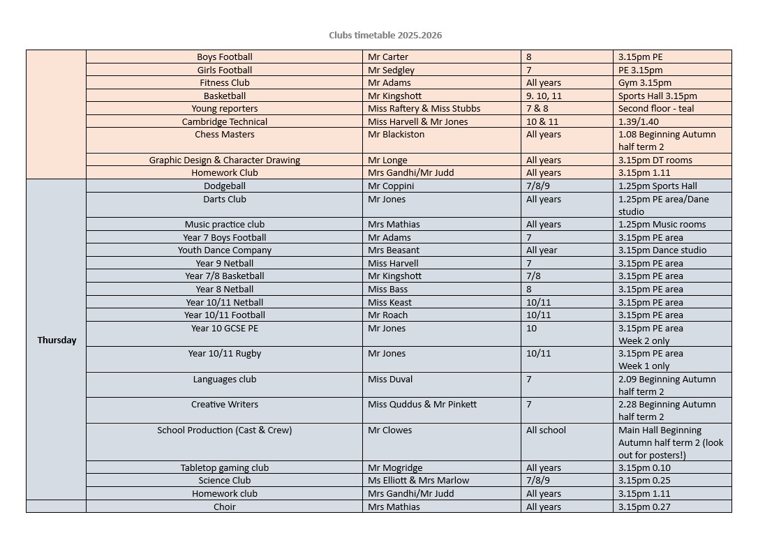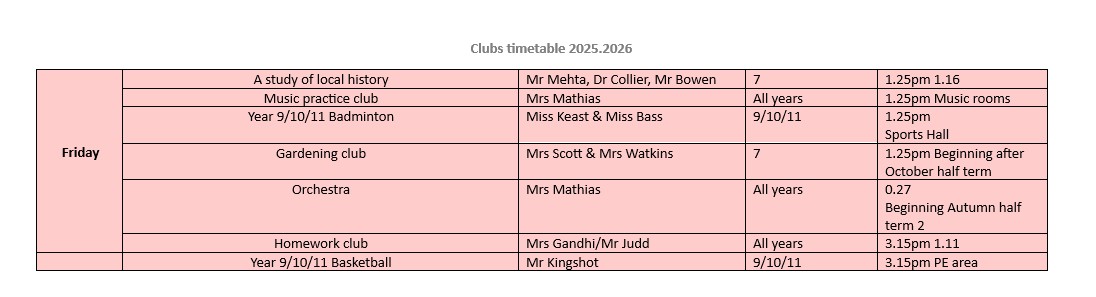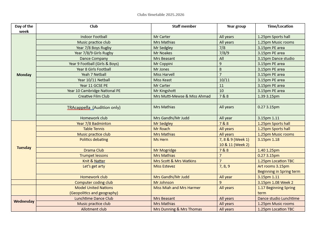 Below are examples of the extra curricular timetable for the academic year 2025/26.